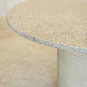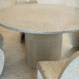 Create an inviting and conscious dining space with the Zerocrete Round Dining Table. This beautifully crafted set includes a generous, solid top and a distinctively textured base, both made with a commitment to circular design. The table’s substantial weight is a reflection of its durable construction and the significant amount of recycled plastic and fabric embedded within. It’s a bold statement piece that embodies the idea that we can create beautiful, lasting furniture while making a positive impact on our environment.